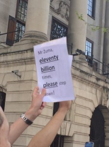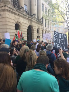 The Democratic Alliance (DA) Abroad organised a demonstration outside South Africa House in London last Saturday in solidarity with the mass action against Jacob Zuma in South Africa the day before. This was a result of the president’s disastrous midnight cabinet reshuffle a week earlier which saw him dismiss and replace the well performing finance minister, Pravin Gordhan, and his deputy, Mcebisi Jonas. As a result the country’s credit rating being downgraded to ‘junk’ status i.e. to sub-investment level threatening the economy and stability in general.