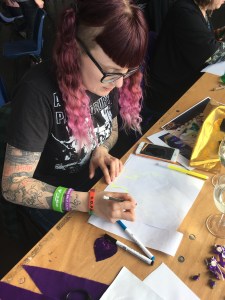 Furnished with fabric and all means of embellishments in the suffragette colours of green, white and purple, we were given the option of making individual banners, collaborating on a large banner already designed or, for the brave, to freestyle on another large banner.